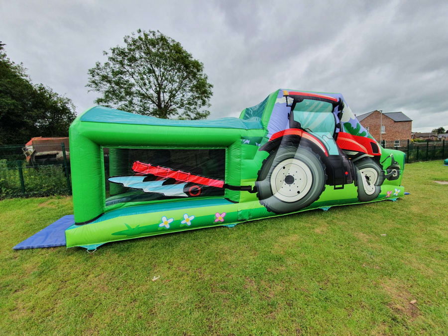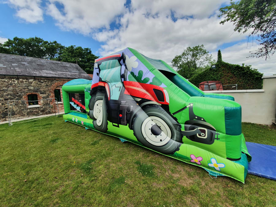 • The 30ft Tractor Assault Course is a thrilling inflatable that challenges kids with obstacles and slides, all within a vibrant, tractor-themed design.