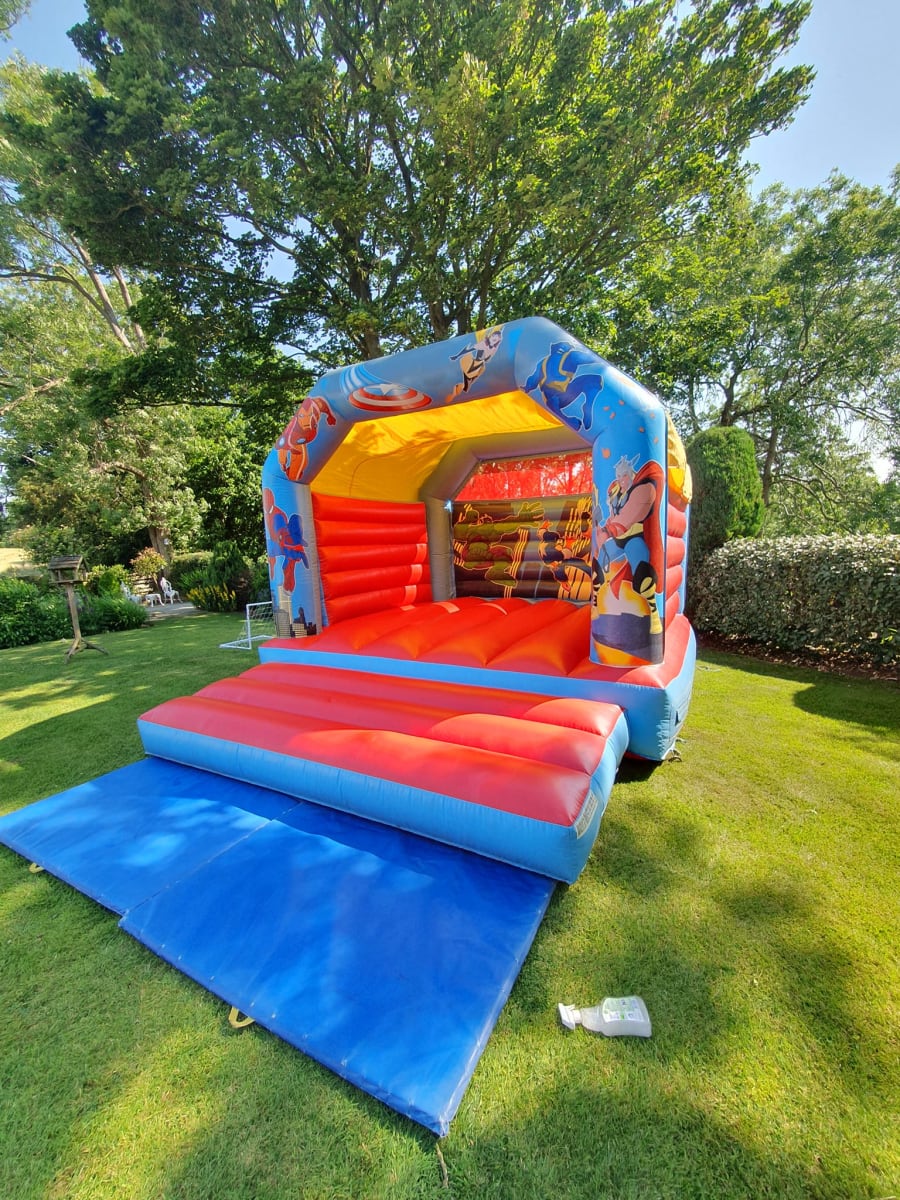 Blending one castle with an activity piece keeps queues moving and everyone happy. Try a classic castle such as the Superhero Bouncy Castle (15ft x 12ft) plus a game like the Foot Darts Kick n Stick or Penalty Shootout. For bigger energy, the Big Rex Dino Assault Course (33ft) is a superb centrepiece.